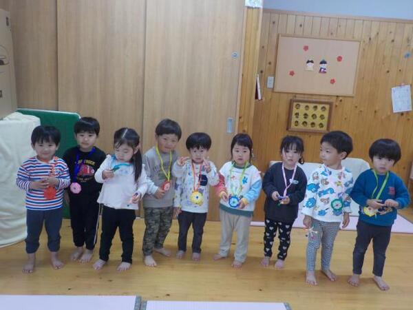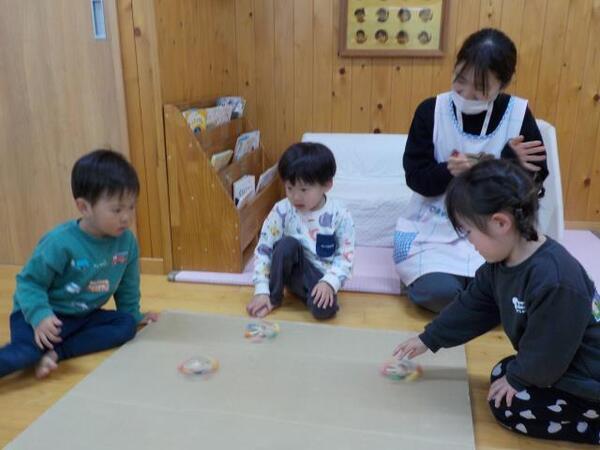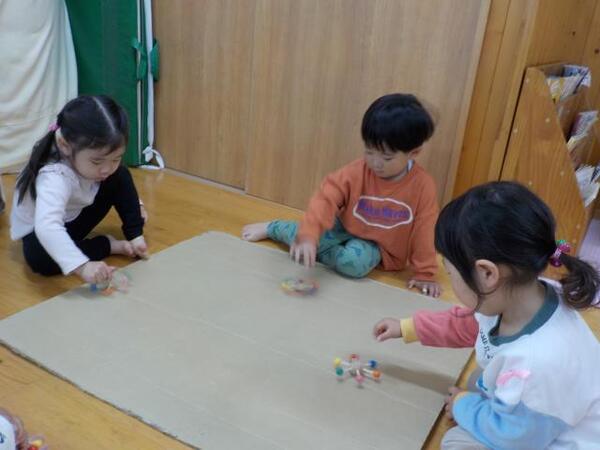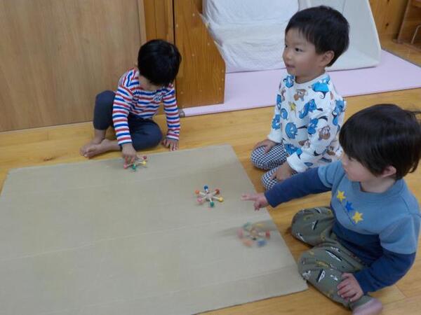 2026/03/03 こま回し遊び(すみれ組)A あれから約1カ月が過ぎ、すみれ組のこま回し遊び第2回戦をしました。子どもたちもやる気満々で参加しました。 第2回戦始めぇ〜 みんな勝つぞ! やる気スイッチが・・すごい すごいでしょ♪ おめでとう!! みんな頑張ったね!!