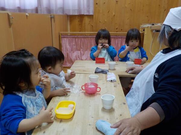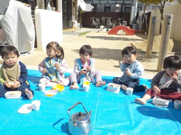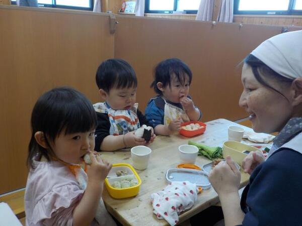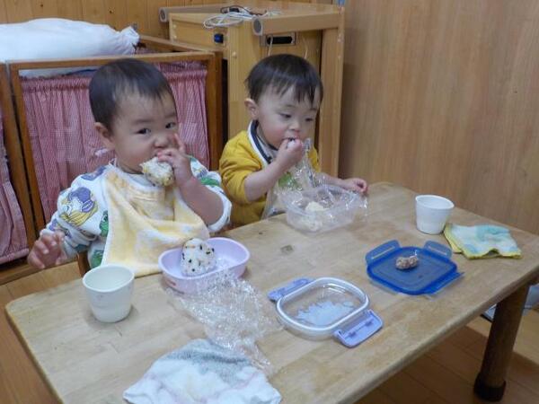 2026/03/11 えんそく🍙No,1 今日はえんそく。朝は曇り空でしたが天気も徐々に良くなり安心しました。ちゅうりっぷ組は庭であそび、部屋でおにぎりを食べました。たんぽぽ組は園庭で思いっきりあそび、庭でおにぎりを食べました。保護者の方々、朝早くからおにぎりを用意していただきありがとうございました。 ちゅうりっぷ組 いただきます もぐもぐおいしいね たんぽぽ組 庭で食べるとおいしいね!!