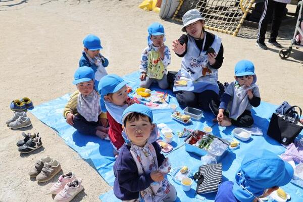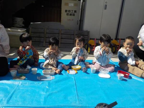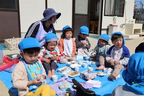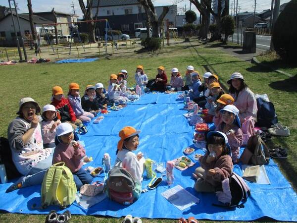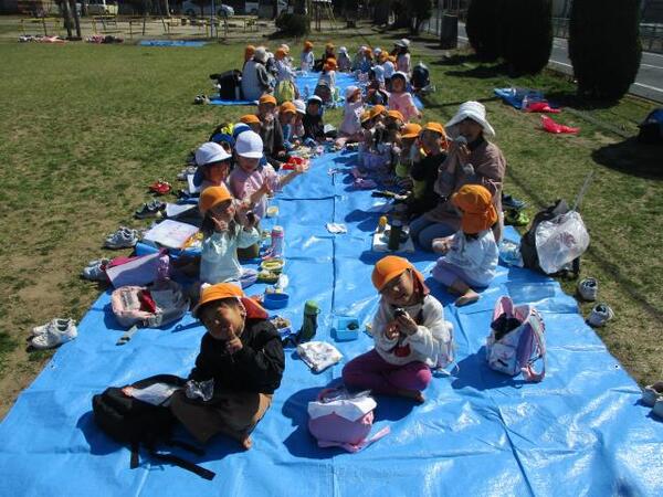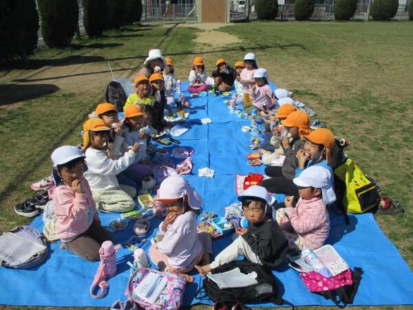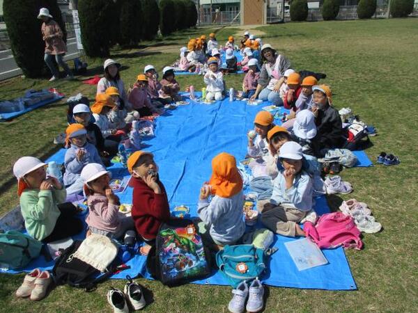 2026/03/11 えんそく🍙No,2 すみれ組は園庭で元気よく遊び、ブルーシートを敷きおにぎりを食べました。ゆり・ひまわり組は金屋公園へ行き仲間と氷鬼や遊具で遊び、おにぎりを食べました。保護者の方々、朝早くおにぎりを作っていただきありがとうございました。 すみれ組 園庭でおにぎりおいしいよ ゆり・ひまわり1組 金屋公園でおにぎり最高!! ゆり・ひまわり2組 美味しかったね!!